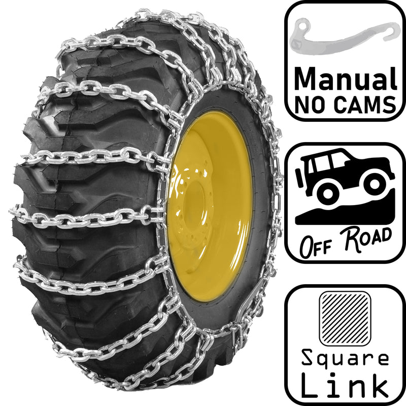 - The square link design improves traction and grip compared to the rounded twist link tire chain